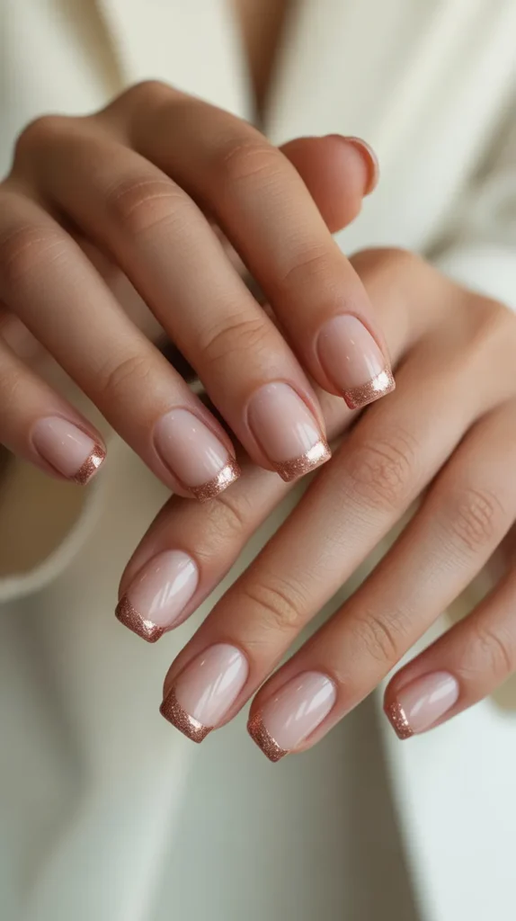 Glitter French tips are a trendy twist on the classic French manicure. Instead of white tips, use rose gold, silver, or holographic glitter. Keep the base nude or pale pink for a clean look.