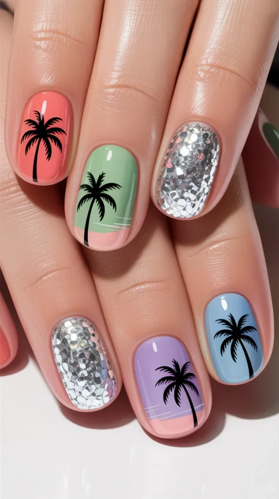 Combine glitter with tropical palm tree art. Use glitter on one nail and a simple palm tree silhouette on another.