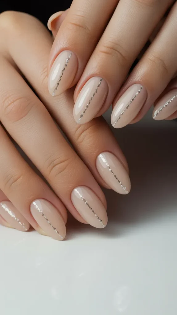 Add thin glitter stripes over a nude or pastel base. This minimalist design looks neat but still festive.