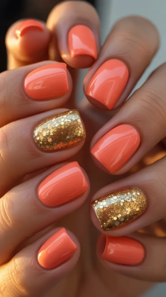 Gold glitter accent nails are simple yet glamorous. Paint most nails in a coral or nude shade and add full gold glitter on one or two accent nails. This design looks festive and is perfect for spring break parties or dinners.