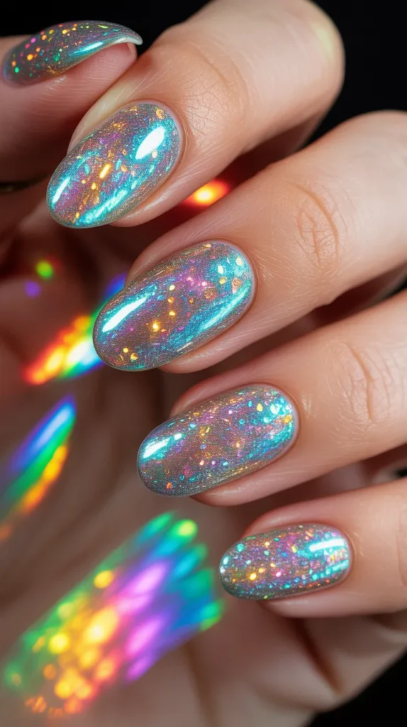 Holographic glitter nails shine in different colors when light hits them. This design looks amazing at pool parties and night events. Apply holographic glitter polish over a clear or pastel base.
