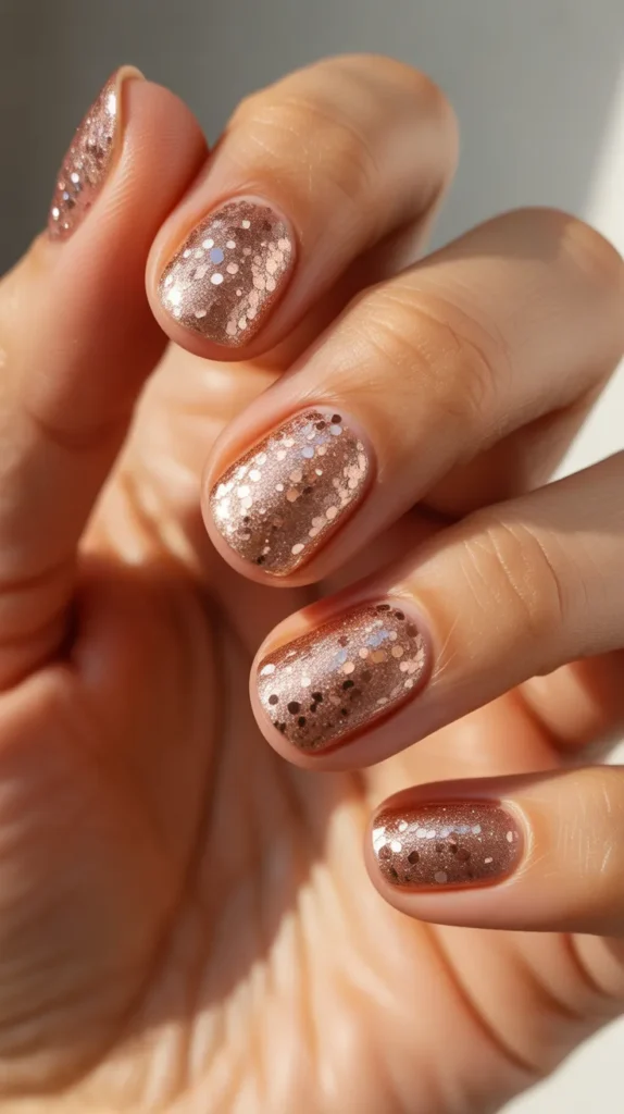 This is an affordable yet high-impact choice. A single bottle of rose gold glitter polish is a smart purchase for many occasions.