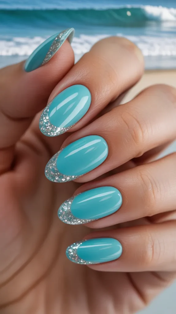 Turquoise nails with silver glitter tips create a beach-inspired look. The blue-green shade reminds you of ocean water, while silver glitter reflects sunlight beautifully. This design is perfect for tropical vacations.
