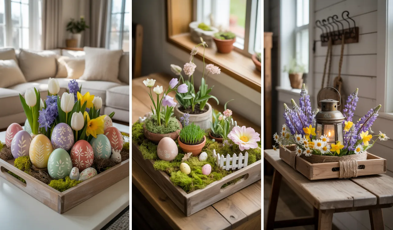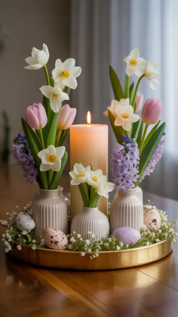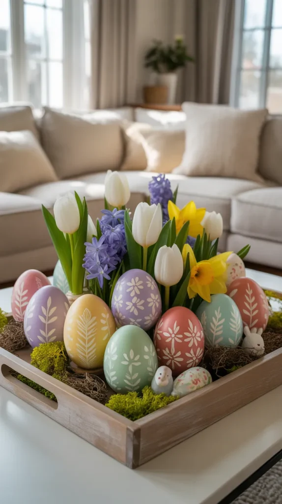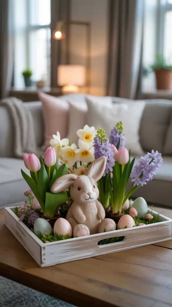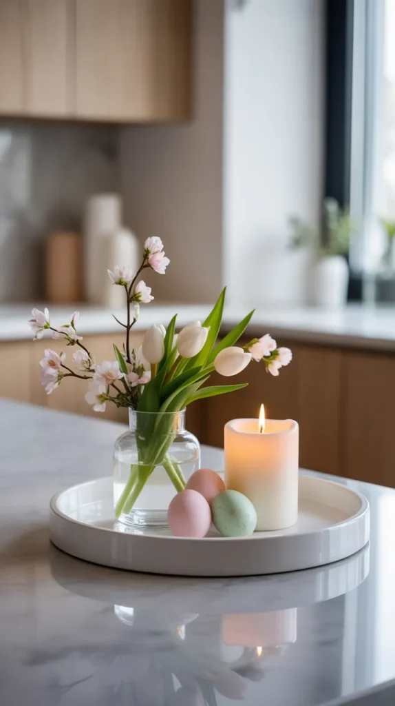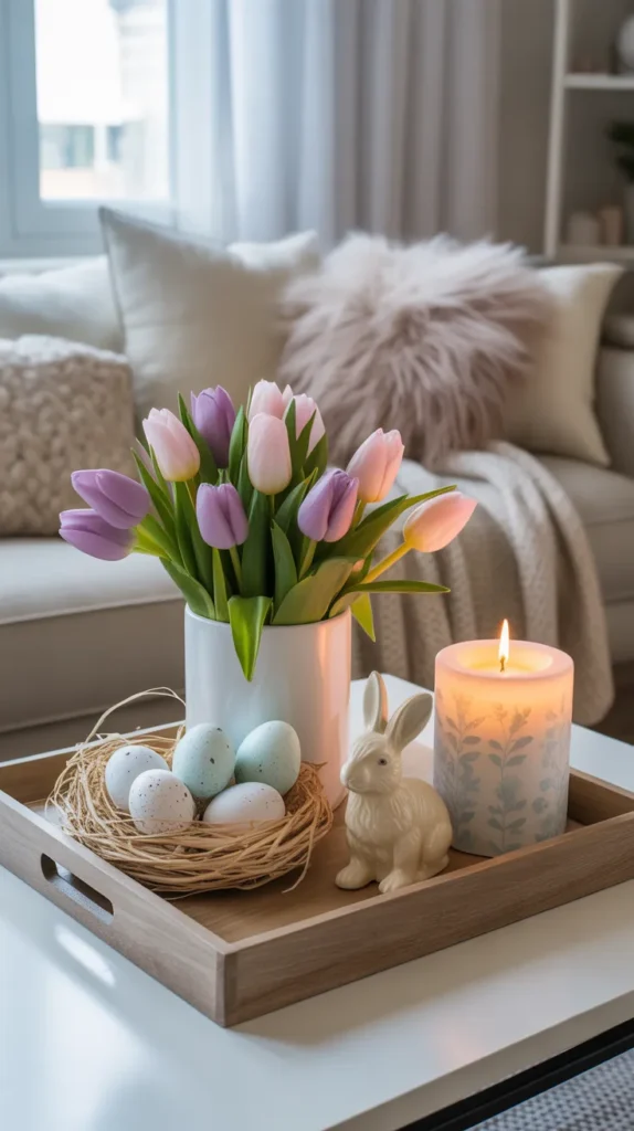 Start with soft pastel tulips placed in a small vase at the center of your tray. Add speckled eggs, a mini bunny, and a neutral candle to balance the colors. This look feels fresh and calm, making it perfect for coffee tables or sideboards.