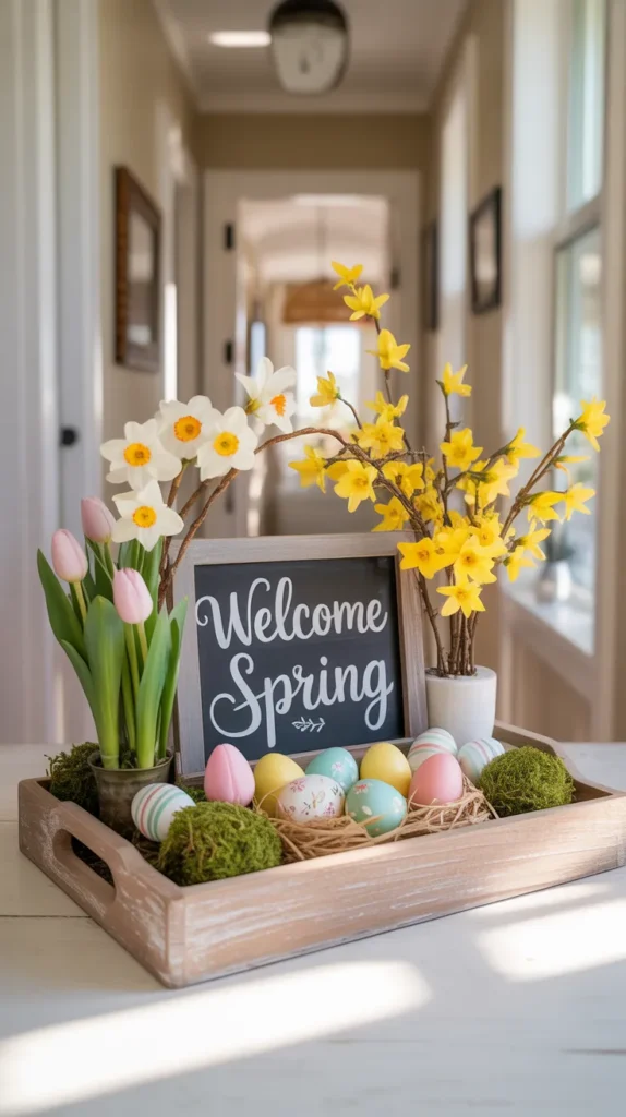 Style a tray near your front door with flowers, greenery, and a small Easter greeting. This creates an inviting first impression.