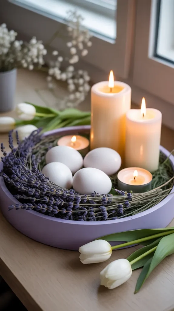 Lavender stems paired with white eggs and candles create a calm spring vibe. This works beautifully on nightstands or bathroom counters.