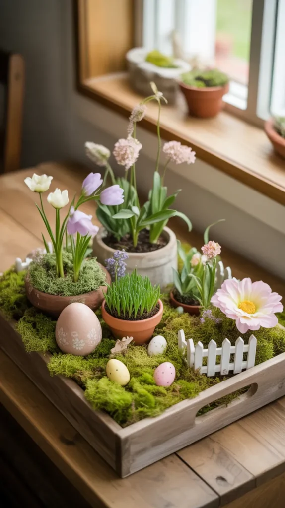 Create a tiny garden scene using faux moss, pastel flowers, and small pots. Add one Easter accent like a bunny or egg for seasonal flair. This playful design works well on entry tables or shelves.