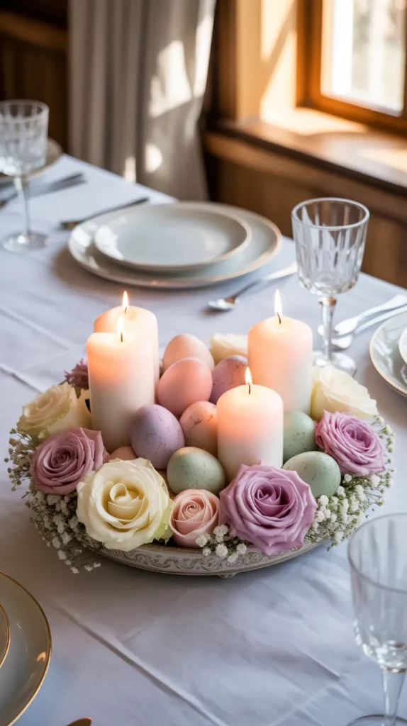 Pair soft pink or cream roses with pillar candles for an elegant spring tray. Place eggs or beads around the base to add texture. This design feels peaceful and works beautifully on dining tables.