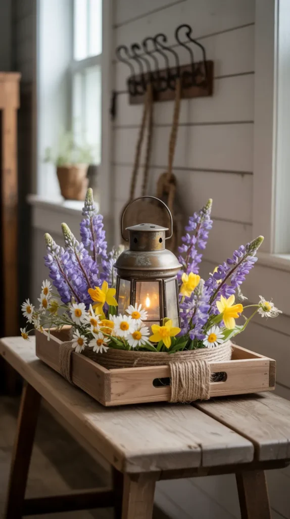 Use wildflower-style stems with a wooden tray and twine accents. Add a small lantern or bunny to finish the look. This relaxed design works well in entryways.