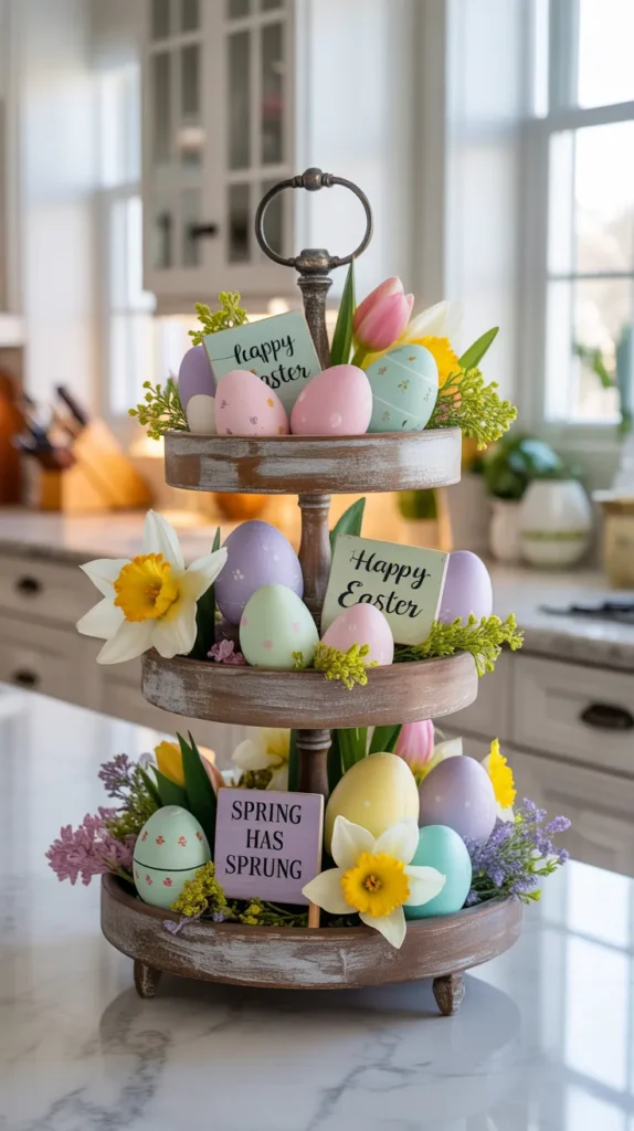 Use a wooden tray with white daisies, mason jars, and soft greenery for a farmhouse-inspired Easter look. Add a small Easter sign or ceramic bunny for charm. This setup feels warm and welcoming, especially in kitchens or dining spaces.