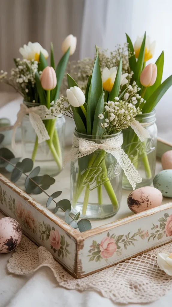 Use glass jars, lace ribbon, and soft florals for a vintage-inspired tray. Add pastel eggs for Easter charm.