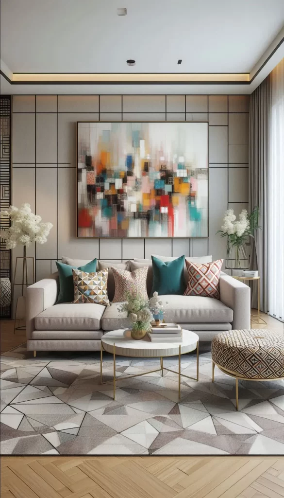 Abstract art and geometric patterns are making waves in living room decor in 2025. Whether through art, rugs, or wall decor, these bold designs add a contemporary edge and serve as focal points in the room.