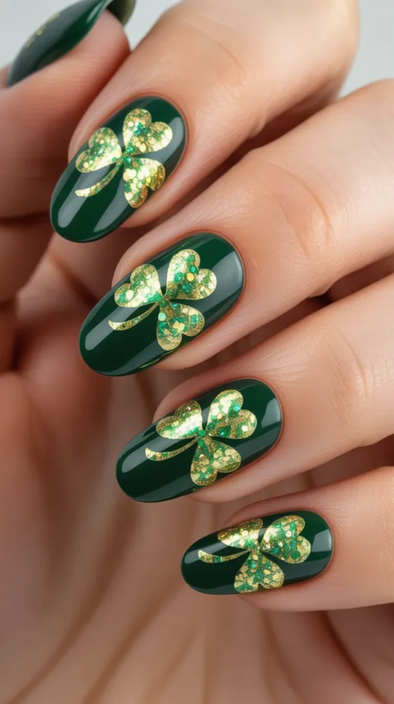 Gold foil clover stickers add a touch of elegance to St Patricks Day nails. These designs look beautiful over emerald green, beige, or soft blush polish. The gold details catch the light and make your manicure feel special without needing salon-level skills.