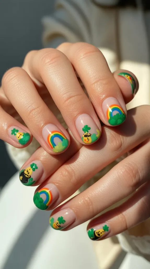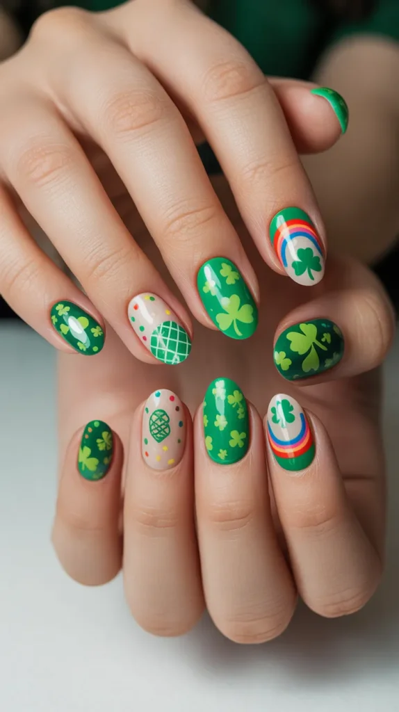 Mix-and-match sticker nails combine clovers, rainbows, stripes, and solid greens on different fingers. This creative style lets you use every sticker in the pack.