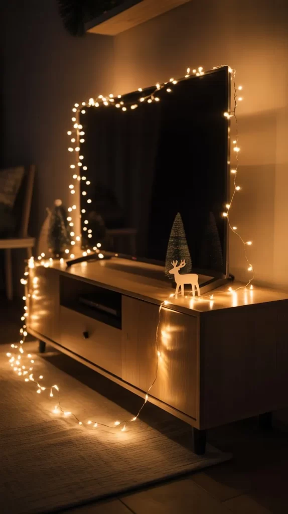 Fairy lights are very budget-friendly and can be reused for every season. They are perfect for anyone who loves a soft, dreamy Christmas look. Even one strand of lights is enough to transform your TV stand into a festive display.