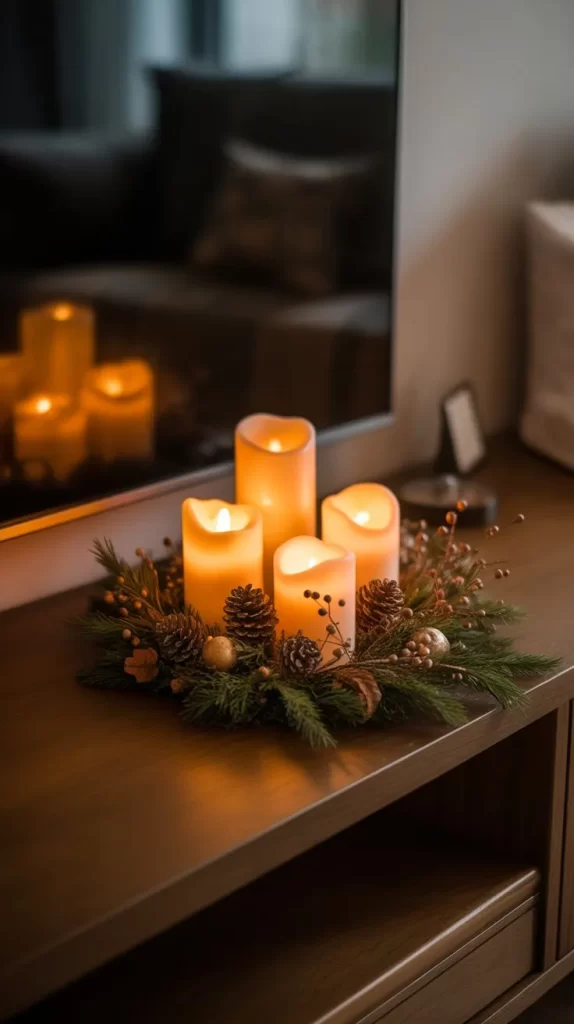 Battery-operated candles are a safe and stylish way to decorate your TV stand. You can group three to five candles of different heights on one side of the stand. The soft, warm glow helps create a cozy Christmas mood. Add a little greenery or a pinecone beside the candles to enhance the winter theme.