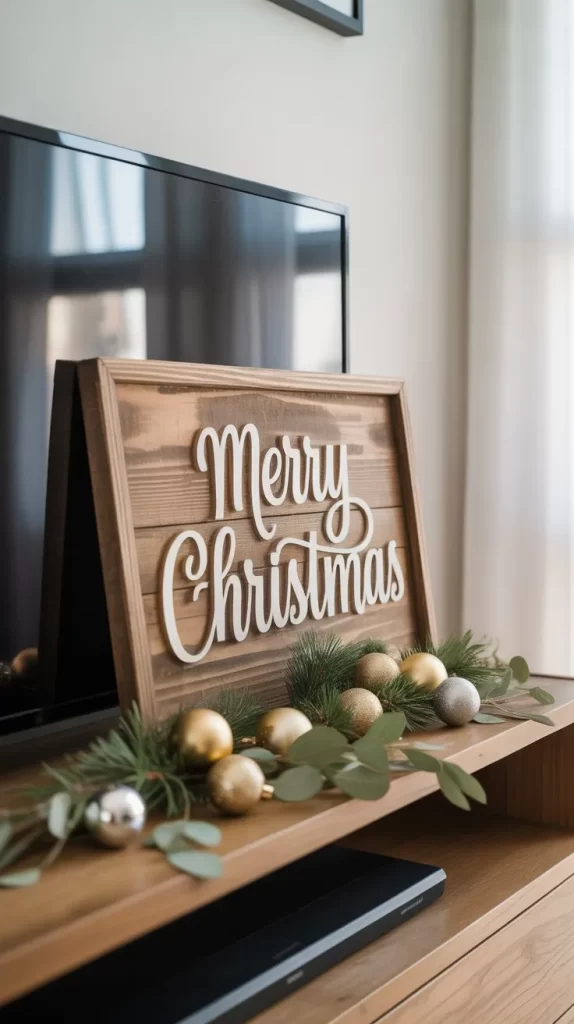 A DIY Christmas sign is a great way to add personality to your TV stand. You can print a simple holiday quote like “Merry & Bright” or “Joy to the World” and place it in a frame you already own. Add a few ornaments or greenery around the frame for a festive touch. This makes your TV area look polished and intentional.