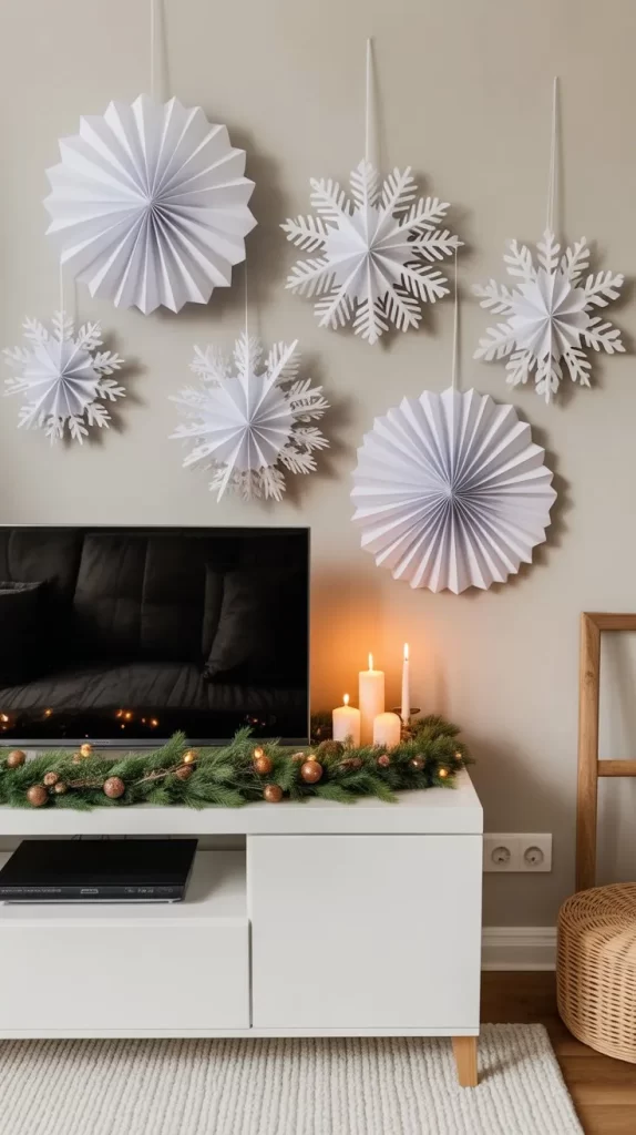 Paper snowflakes are one of the cheapest Christmas decorations you can make. Cut out snowflakes using white craft paper and place them along the TV stand or tape them lightly to the back wall. Add a small candle or greenery to complete the scene. The snowflakes give your living room a charming winter look.