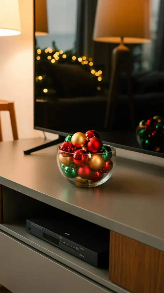You don’t need expensive decorations to make your TV stand look festive. A small bowl or clear vase filled with colorful ornaments can make a beautiful centerpiece. Choose ornaments in colors that match your living room or stick to classic red, green, or gold. Place the bowl on one side of the TV stand so the display feels balanced.
