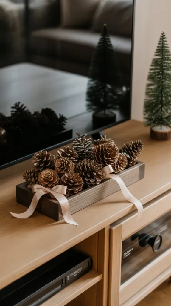 Pinecones are a free or low-cost decoration you can use for Christmas. Gather pinecones, clean them, and place them in a small basket, bowl, or wooden tray. Tie a ribbon around a few pinecones for a cheerful touch. Set the tray on your TV stand to bring a natural, rustic vibe.
