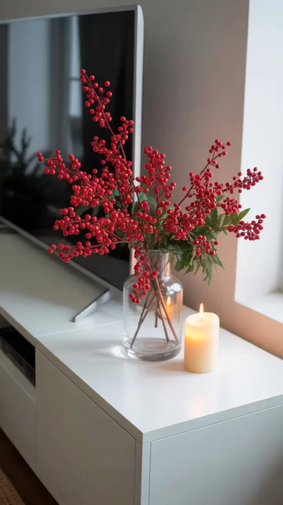 Red berry stems are inexpensive and make great Christmas decorations. Place a few stems in a vase or jar and set it next to the TV. The bright red color adds a festive pop, and the stems create height and texture. Pair the vase with a candle or small figurine to complete the look.