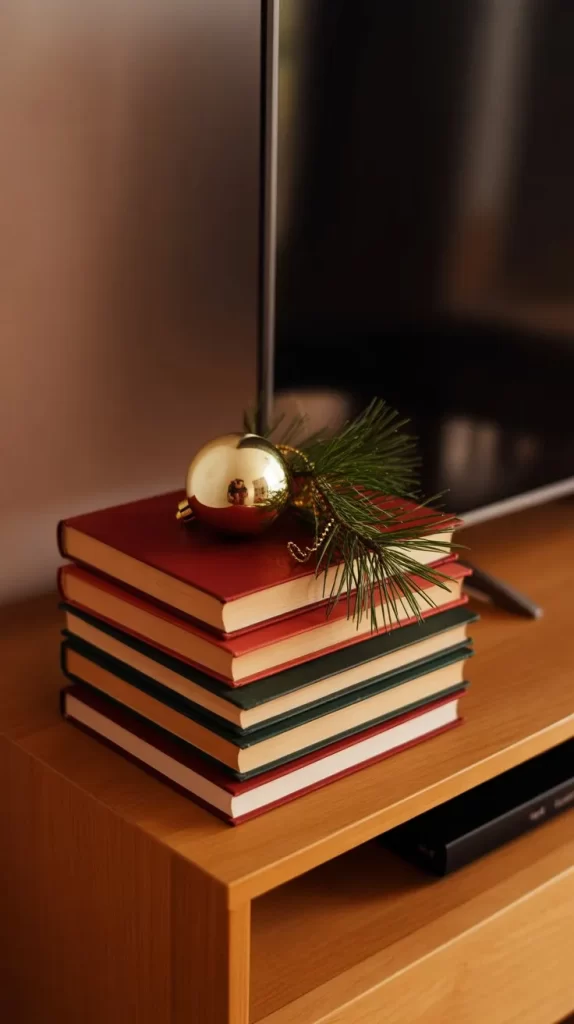 If you have books at home, you can use them as holiday décor. Stack books with red, green, white, or gold covers on one side of the TV stand. Add a small ornament, candle, or pine branch on top. This creates height and brings a festive touch without buying anything new.
