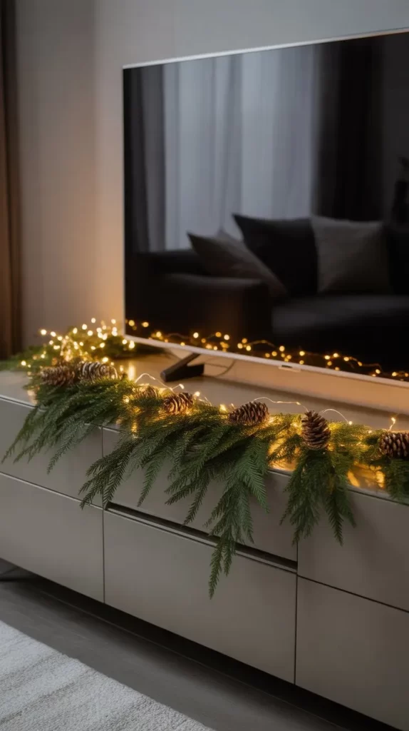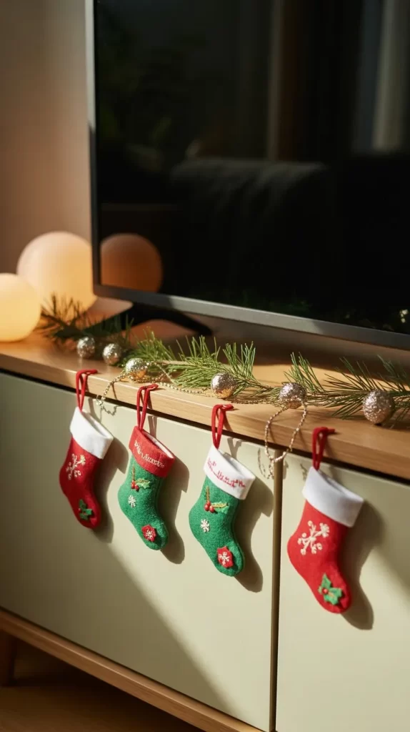 Instead of hanging stockings on the fireplace, hang one or two mini stockings from the edge of the TV stand. You can also drape a short garland across the front. This adds instant Christmas charm without being too bold or expensive. Choose neutral or classic red stockings based on your décor style.
