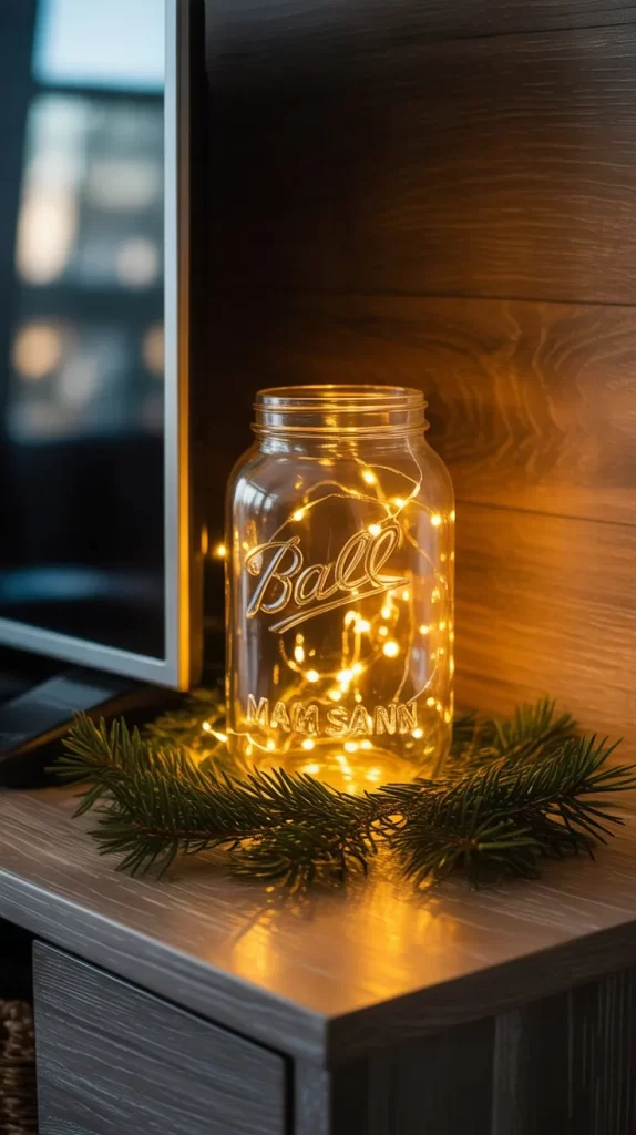 If you want a magical Christmas look on a budget, place fairy lights inside a glass jar or vase. Put the jar on your TV stand and let the soft lights glow at night. You can add pine branches or ornaments around the jar for extra charm. This looks beautiful and takes only a minute to set up.
