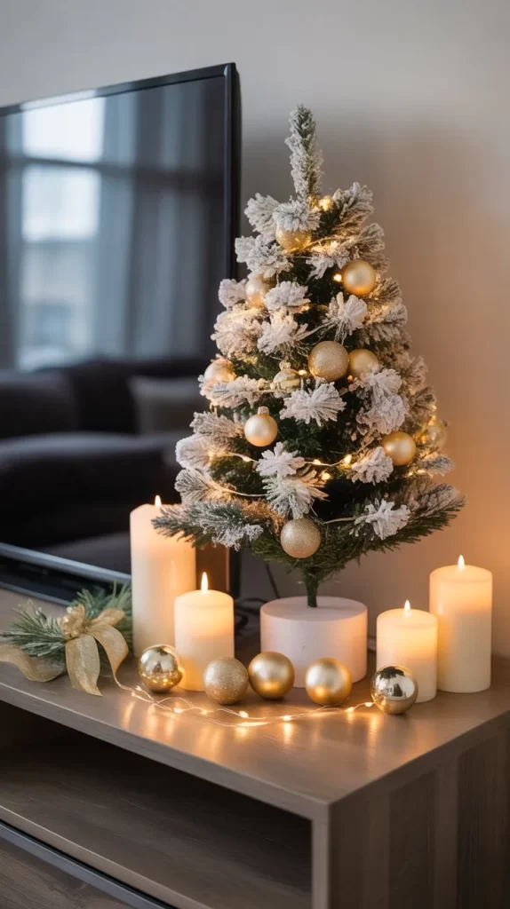 A mini Christmas tree is an easy and affordable way to decorate your TV stand. You can find small tabletop trees at a very low cost. Add tiny ornaments, a ribbon, or fairy lights to make it look festive. Place the tree on either side of the TV to create a charming and balanced look.