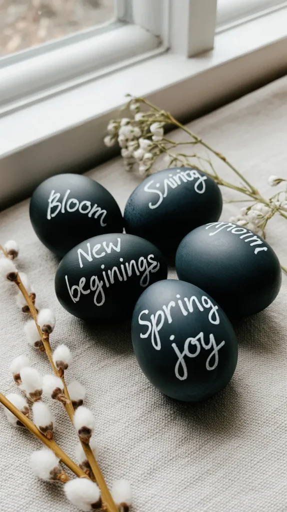 Paint eggs with chalkboard paint and write Easter messages using chalk or white pens. You can change the designs every year, making these eggs reusable and cost-effective.