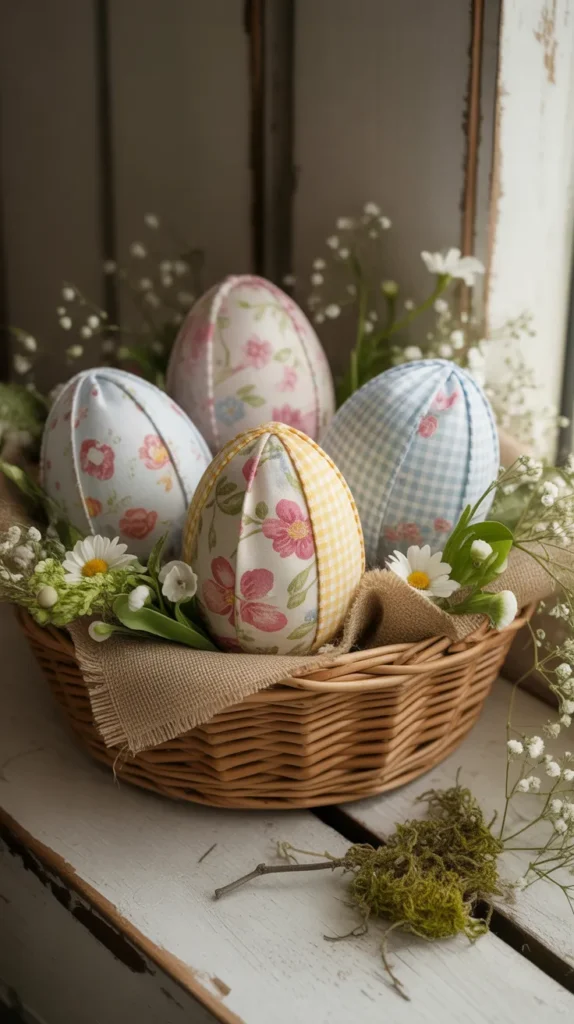 Wrap eggs in scrap fabric using glue or Mod Podge. Choose floral, gingham, or neutral prints for a cozy handmade look. This is a great way to reuse fabric leftovers, making it eco-friendly and affordable.