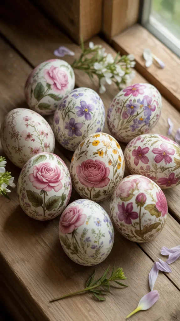 Floral decoupage eggs use printed napkins or tissue paper to add delicate flower designs. Carefully cut out floral shapes, apply with glue, and seal with a clear coat. The result looks detailed and professional, even though the process is simple.