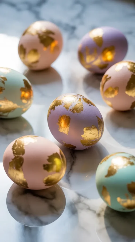 Gold leaf Easter eggs bring instant elegance to your holiday table. Paint your eggs in white, blush, or light gray, then gently apply gold foil sheets using craft glue. The metallic accents create a luxury look without a luxury price tag. Each egg becomes a small art piece, perfect for centerpieces or gift baskets.