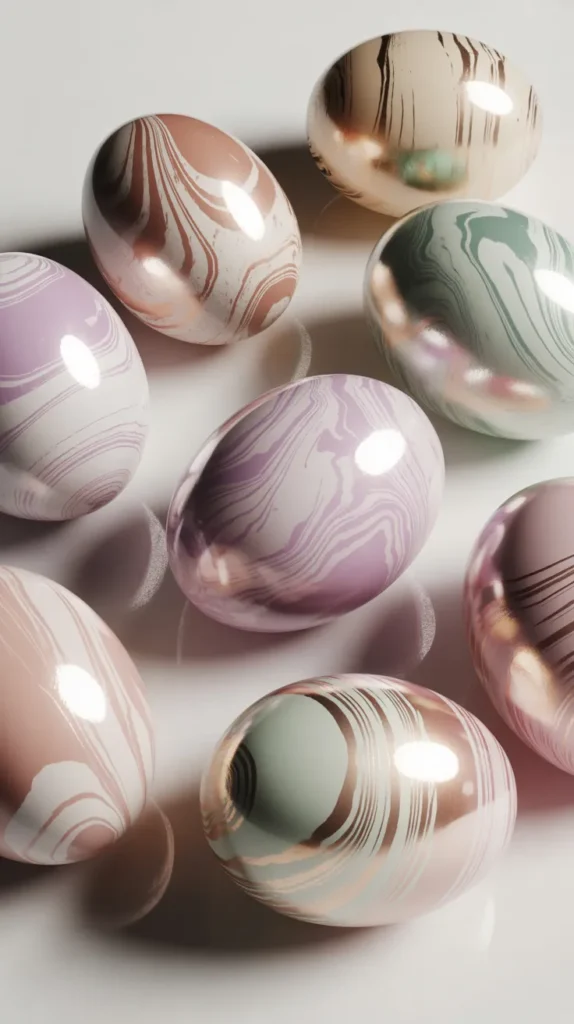 Marble eggs look high-end but are surprisingly easy to make. Use nail polish or oil-based paint swirled in water, then dip the eggs for a marble pattern. The results feel modern and artistic.