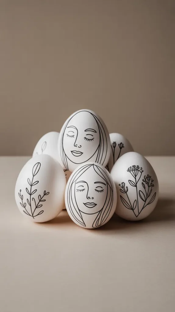 Minimalist line art eggs feature simple black or white drawings over neutral backgrounds. Use fine-tip markers or paint pens to sketch faces, leaves, or abstract shapes. This style fits modern homes and looks great in clean, white spaces.