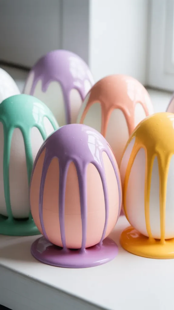 Drip paint eggs are playful and trendy. Start with white or pastel-colored eggs, then slowly drip contrasting paint from the top, letting it flow naturally. Each egg turns out different, which adds charm and personality to your display. Kids love this technique because it feels creative and mess-friendly.