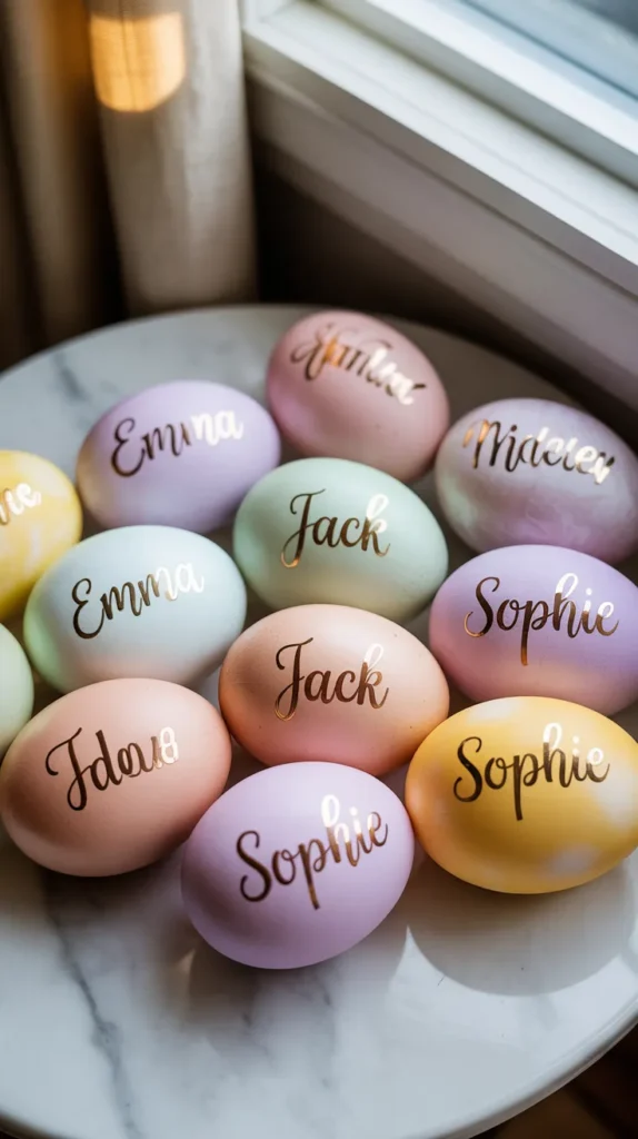 Write names or initials on eggs using paint pens or vinyl stickers. These eggs work beautifully as table placeholders or small gifts.