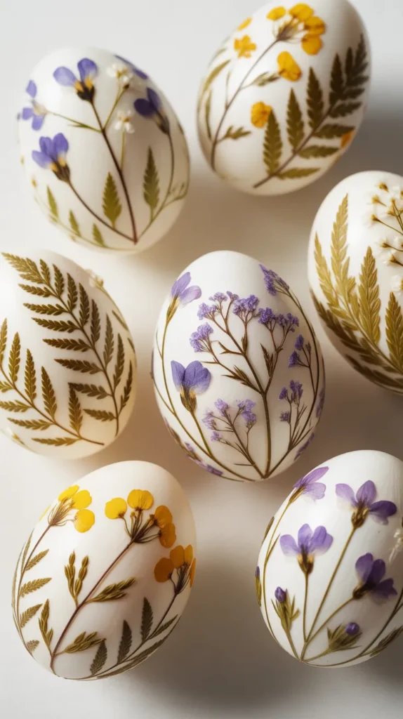 Glue small pressed flowers onto white eggs for a botanical look. Seal with clear varnish to protect the design. These eggs feel delicate and nature-inspired.