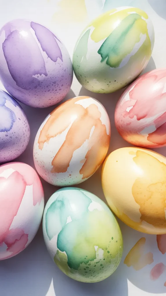 Watercolor eggs have a soft, dreamy finish. Use diluted watercolor paints to create gentle color blends on each egg. Let colors flow naturally for a light and artistic look. Every egg becomes unique, making your display feel handmade and special.