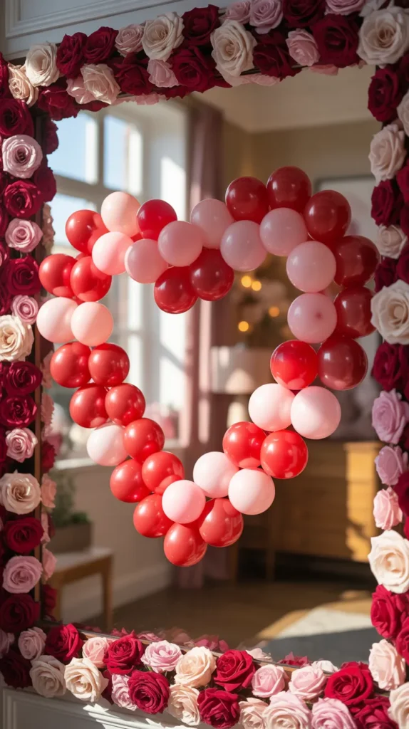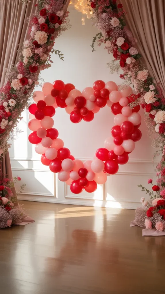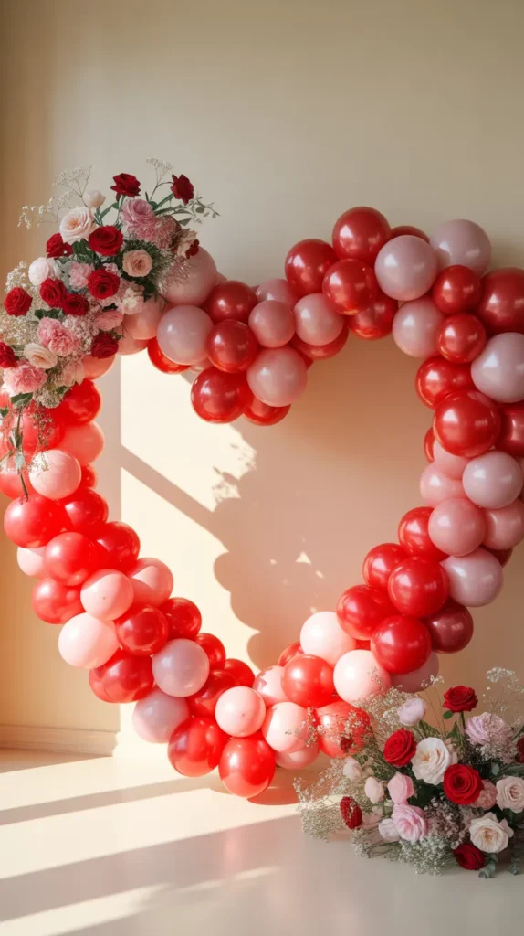 A heart-shaped balloon frame is a great idea if you want a clean photo backdrop. Create a heart outline using balloons attached to a simple frame or wall shape. Add flowers only in two corners, like the top left and bottom right, to keep it elegant. This creates a romantic look without using too many flowers.