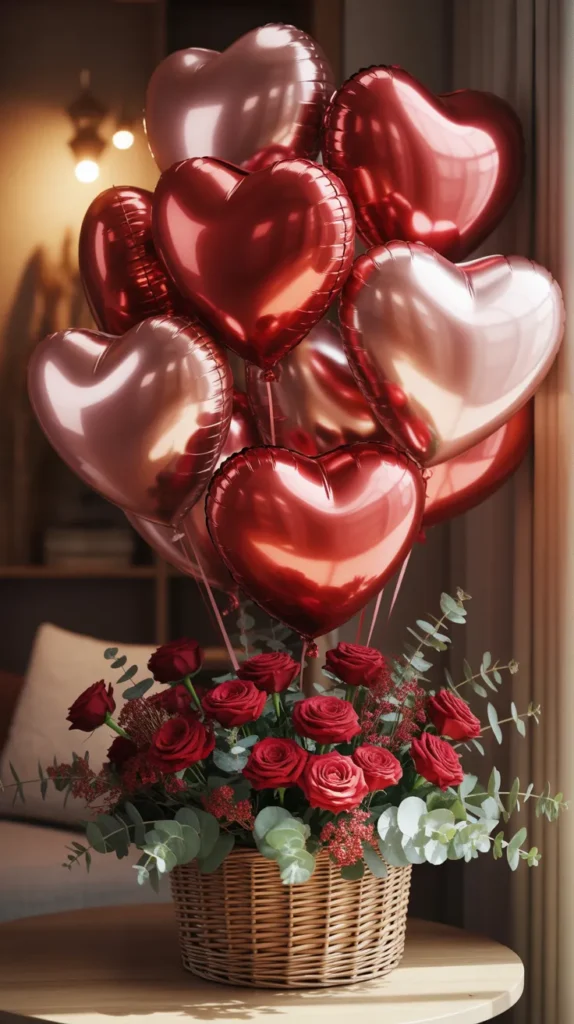 A balloon heart basket is cute, simple, and perfect for gifting or table decor. Use a small basket as the base and attach heart balloons above it like a bouquet. Fill the basket with flowers, greenery, and maybe a few wrapped chocolates for extra charm. This looks romantic and works well for Valentine’s Day surprises.