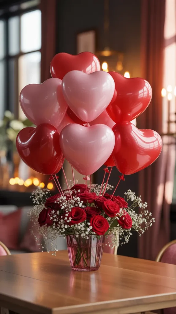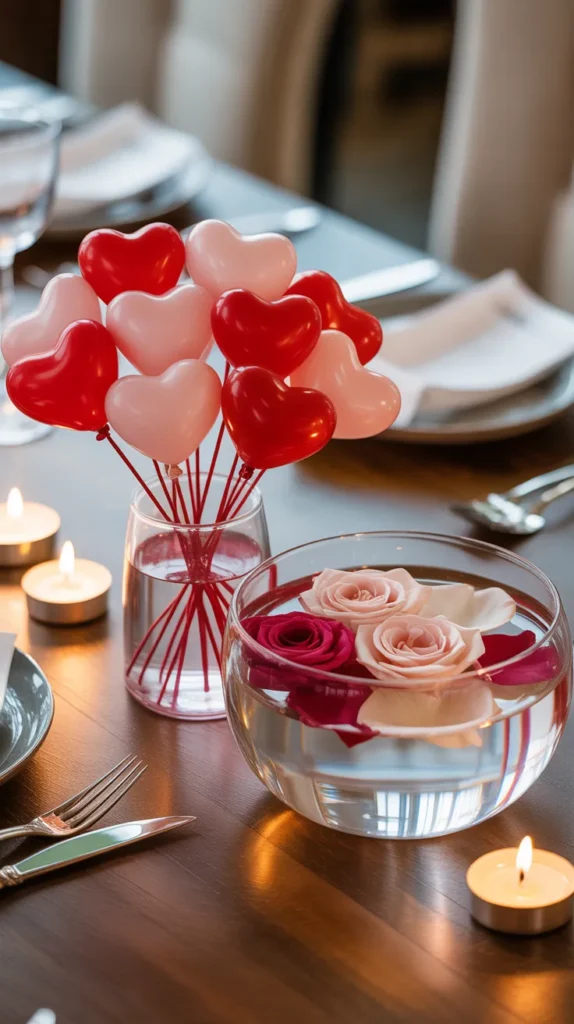 This idea is simple but looks very fancy for dinner parties. Create a small heart balloon centerpiece using mini balloons in red and pink. Place it beside a clear bowl filled with water and floating flowers like rose petals or small blooms. The mix of balloons and flowers feels romantic and elegant.