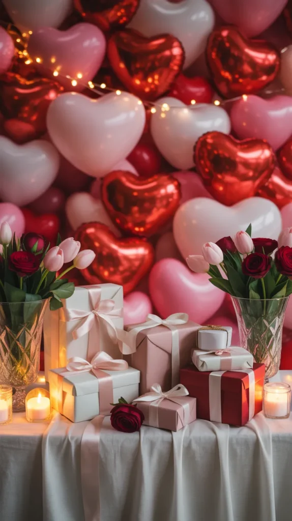 A balloon heart gift table setup is perfect for Valentine’s Day parties or surprise celebrations. Create a heart balloon shape behind the table using red and pink balloons. Then place simple flower vases on the table with roses, tulips, or mixed blooms. The balloons create the bold background while the flowers add softness and romance.