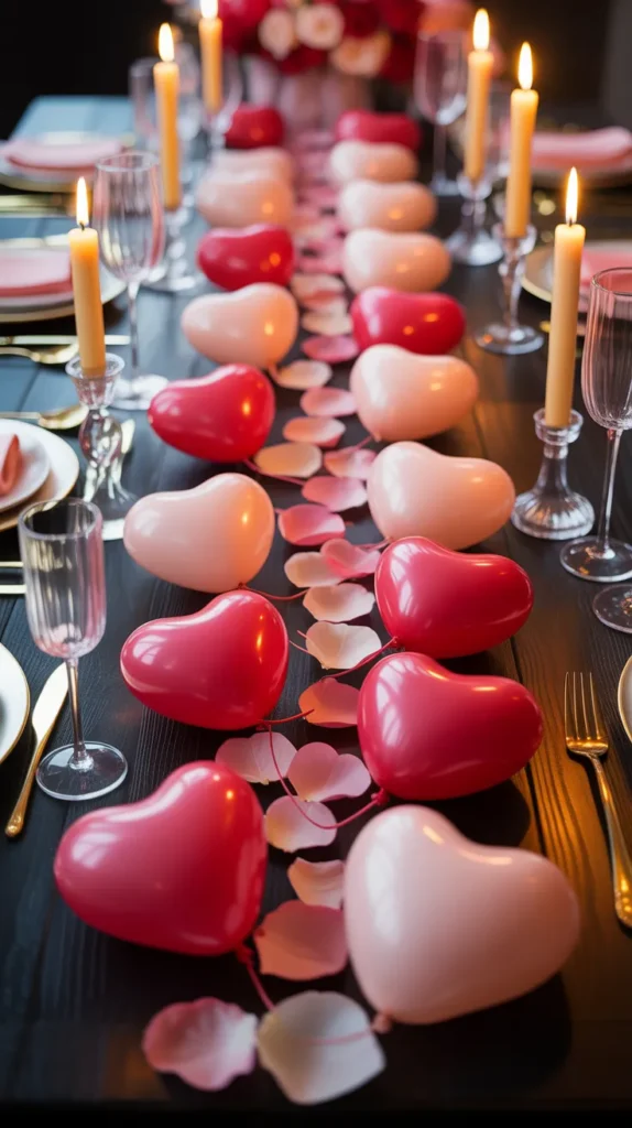 A balloon heart table runner is a fun and simple Valentine’s Day heart decoration for dinner setups. Use small balloons to create heart shapes and line them down the center of the table. Add rose petals or faux flower petals between the balloon hearts for a soft romantic look. This works well for date nights, family dinners, and Valentine parties.