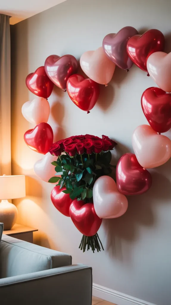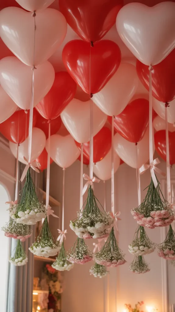 Hanging heart balloons create a romantic ceiling effect that feels special but stays simple. Inflate red and pink heart balloons and hang them at different heights using clear string. Attach small flower strings or mini flower bundles to the bottom of each balloon so the flowers “drop” down like a soft curtain. This looks beautiful over a dining table or in a photo corner.