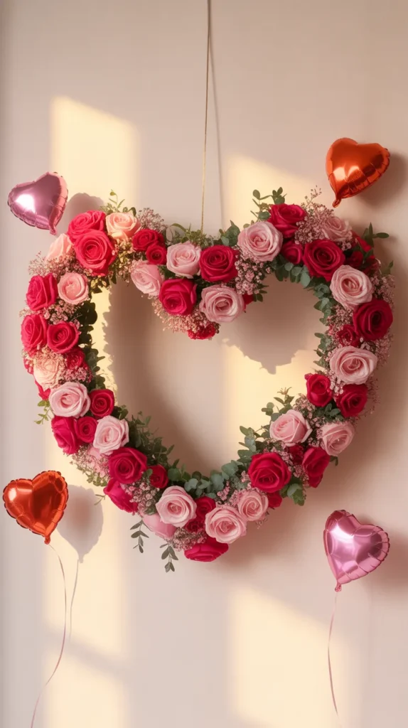 A floral heart wreath is a sweet decoration for a door, wall, or mantel. Use a heart-shaped frame and attach flowers like roses, peonies, or carnations to form a full heart. Then add a few mini balloons in soft pink or red around the edges for a playful Valentine touch. This mix of balloons and flowers feels balanced and romantic.