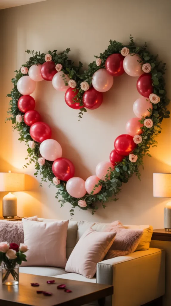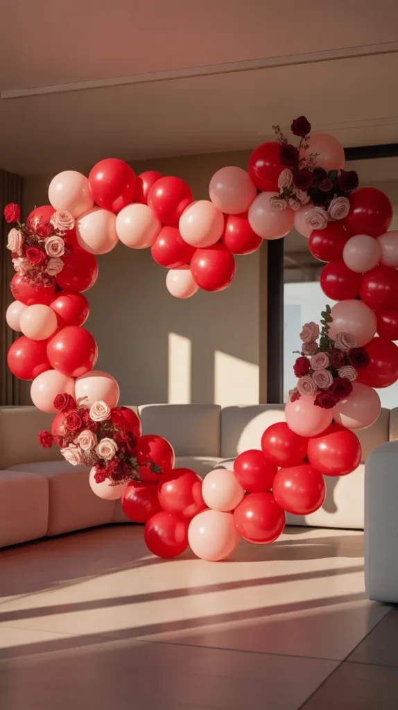 A heart balloon garland looks more natural and romantic when you add greenery. Create a garland using red and pink balloons and shape it into a heart curve or heart outline. Then tuck in eucalyptus-style greenery and small flower picks like roses or peonies. This creates a soft, elegant Valentine’s Day look.