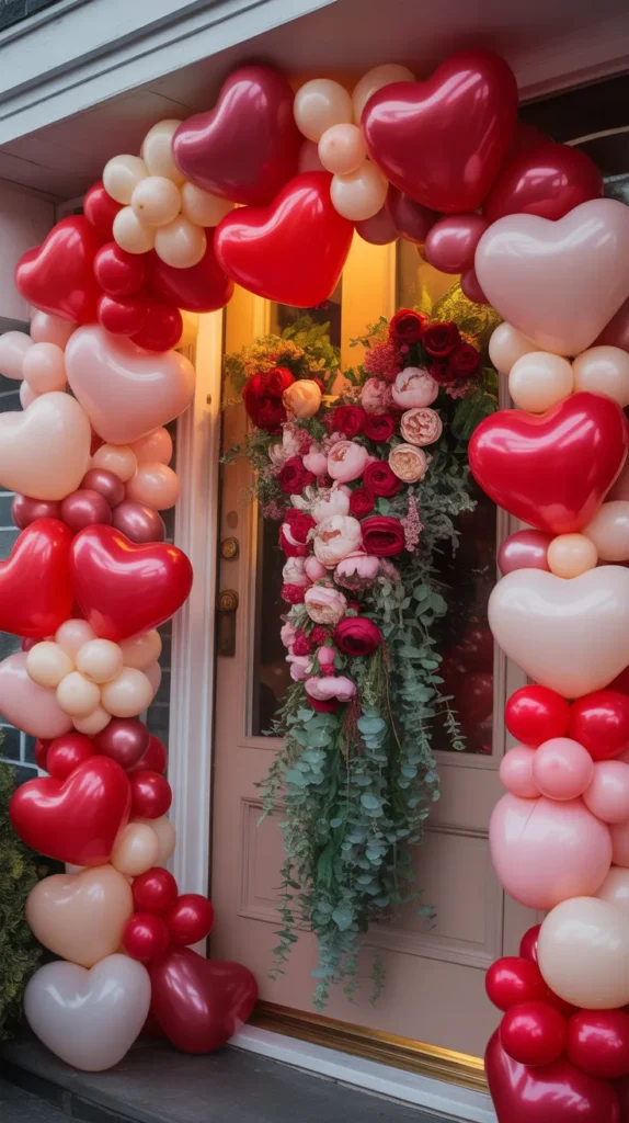 A heart balloon doorway is a fun way to decorate an entrance for Valentine’s Day. Place balloons around the doorway in a heart-inspired curve, using red and pink tones. Add a floral swag at the top center with roses and greenery to make it feel romantic and welcoming. This looks great for parties and photo moments.