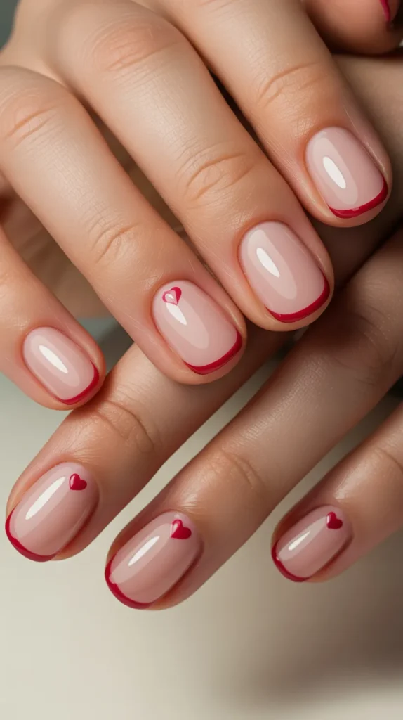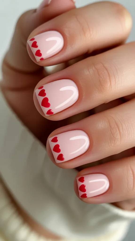 French tips look great on short nails when you keep them thin and neat. For this design, use a light pink base and replace the classic white tip with tiny red hearts along the edge. The hearts act like a playful border and give your nails a romantic Valentine look without feeling too heavy. It’s a cute option if you want something detailed but still soft.