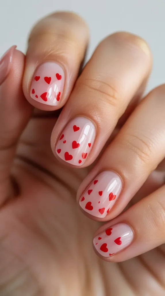 This design looks playful and fun, like Valentine sprinkles. Start with a pink base, then add tiny red dots and mini heart shapes across the nails. You can mix small hearts and dots to create a scattered pattern. This works well on short nails because the design stays light and balanced.